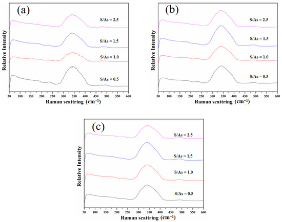 Raman spectra of the precipitates-As(III) for different S(-II)/As(III) at (a) 0 °C, (b) 30 °C, and (c) 60 °C.