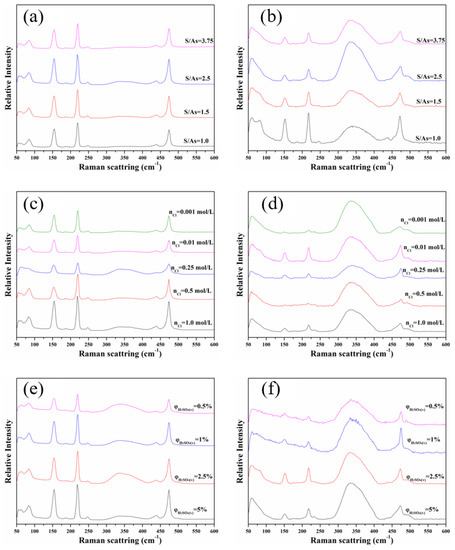 Raman spectra of the precipitates-As(V): (a) different S(-II)/As(V) at 0 °C; (b) different S(-II)/As(V) at 30 °C; (c) different cCl− at 0 °C; (d) different cCl− at 30 °C; (e) different φH2SO4(v) at 0 °C; (f) different φH2SO4(v) at 30 °C.