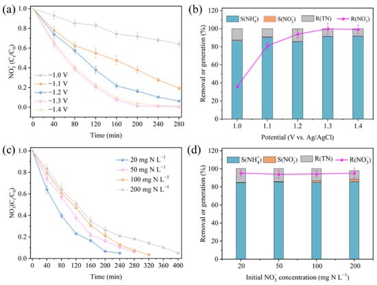| Cathodic Potential (V vs. Ag/AgCl) a | NO3− Concentration (mg N L−1) b | ||||||||