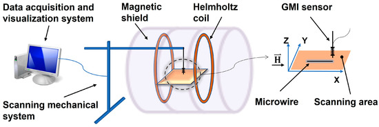 For measurements of local stray magnetic fields near Fe-rich microwire samples, a scanning GMI magnetometer was used [15], which was additionally equipped with a homogeneous magnetic field source based on Helmholtz coils (HCs). The functional setup of the upgraded GMI magnetometer is shown in Figure 1. As in the original version, the scanning magnetometer are a two-layer magnetic shield, inside which a GMI magnetometer with a miniature GMI sensor based on a Co-rich microwire and a non-magnetic mobile XYZ mechanism with a coordinate table for mounting the sample are placed. The scanning GMI magnetometer is controlled by means of a customized data acquisition and visualization system on a personal computer with specialized software. During the measurements, the miniature GMI sensor was positioned vertically, along the Z axis, at a minimal distance of Z0 ~ 0.5 mm from the working surface of the coordinate table (X-Y plane). The microwire sample to be studied was fixed so that its centerline was parallel to the X axis. In the course of the experiments, the vertical component of the magnetic field above the sample was measured, depending on the X-Y coordinates, Bz(x, y).