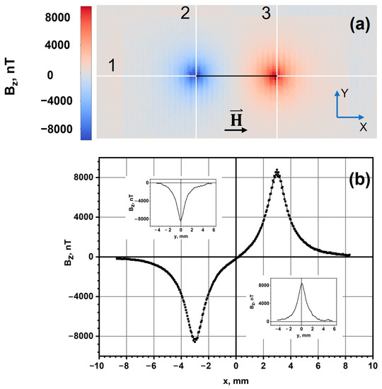 The data represented in Figure 3 show that the magnetic extremums were blurred and neared each other in the magnetic images of a microwire with a length of 2L = 6.5 mm, in the area of weak bias fields (±60 A/m). This occurred primarily due to the small length of the microwire sample. In order to minimize the influence of the microwire ends, we also studied a 15.5 mm microwire sample. A two-dimensional image of Bz(x, y) near the microwire ends is shown in Figure 4a. This image was also obtained under the influence of a HC magnetic field of 400 A/m in magnitude along the microwire length. Figure 4b shows an individual magnetic profile of Bz(x) near the right-hand end of the microwire, measured at a height of ~1 mm. Similarly, to the case with the 6.5-mm sample, the amplitude of the stray magnetic fields near the end of a 15.5-mm segment reached the same value of ±8200 nT, but the signal here dropped to virtually zero by the third portion of the length (~5 mm) of the microwire sample. Thus, in the case of measurements of a long microwire (2L > 10 mm), it is possible to measure near one of the ends of the microwire and neglect the influence of the far end. The inset in Figure 4b shows the expected distribution of magnetization in the closure domain of the microwire.