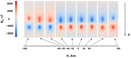 Figure 3 shows a series of magnetic images of a 6.5-mm microwire depending on the magnitude of the HC longitudinal magnetic field. As follows from the presented magnetic images, at the maximum value of the bias magnetic field (+300 A/m), the positive and negative maximums of Bz(x, y) of the magnetic field component are localized near the ends of the microwire. As the magnetizing field is lowered down to zero and the sign was decreased to a value of −40 A/m, the maximums are stretched along the microwire centerline. Next, with a field value of −50 A/m, the color of the maximums in the magnetic image changes to the opposite one, which indicates an abrupt reversal magnetization of the wire. A further increase in the negative bias field (−300 A/m) leads to localization of the negative and positive maximums of Bz(x, y) near the microwire ends. Therefore, consecutive measurement of distribution of Bz(x, y) magnetic fields in external bias fields allowed for examining the bias magnetization process of the studied microwire in detail.