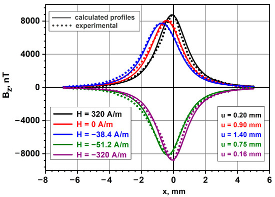 Figure 5 shows experimental (dots lines) and theoretical (solid lines) profiles of the magnetic induction component Bz(x) above the right-hand end of a 15.5 mm microwire with a metal core radius of 8.4 µm in the external longitudinal field Hx of different magnitudes. The best match of the calculated and measured profiles was found to have been obtained with the selected scanning height Z0 of ~0.5 mm. The matching rate of the experimental and calculated data demonstrates the adequacy of the model proposed for the description of properties of the concerned microwires. The upper curves in Figure 5 show that the consecutive reduction of the external field from +320 A/m (black curve) down to −38.4 A/m (blue curve) involved the lowering and shifting of the magnetic induction component’s maximum towards the center of the microwire. After switching the magnetization, which occurred in the same range of fields (from −40 A/m to −50 A/m), as in the case of the short sample, shown in Figure 3, the Bz(x) component changed its sign and became negative (green curve), while the shift of the signal’s minimum towards the microwire’s center decreased, and at an external negative field of −320 A/m the position of the minimum (purple curve) is virtually matched the position of the maximum with a field of +320 A/m. The good matching of the experimental and calculated curves (profiles) in Figure 5 suggests that the dynamics of position of the maximum Bz(x), with the changing external field Hx, is totally determined by the blurring width of magnetic charges u. The values of the u quantity for each measured induction profile are shown in the right-hand corner of Figure 5. In a sufficiently strong external field of 320 A/m the magnetization value was J0 ≈ 8.3 × 106 A/m. This quantity can serve as an estimate of the saturation magnetization Js.