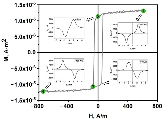 For comparison, the insets in Figure 6 show the profiles of the normal component of the field (insets 1–4) measured at a height of ~1 mm, with magnetic field values indicated by the relevant points on the hysteresis curve. The extremums of magnetic induction can be seen to be expanding and shifting towards the center of the microwire segment in small fields, which is attributable to the blurring of the terminal magnetic charges. At the same time, the extreme values of induction slightly decreased, which is explained by the lowering magnetization in the small external field and consistent with the measurements of the hysteresis curve taken with the vibrating sample magnetometer.