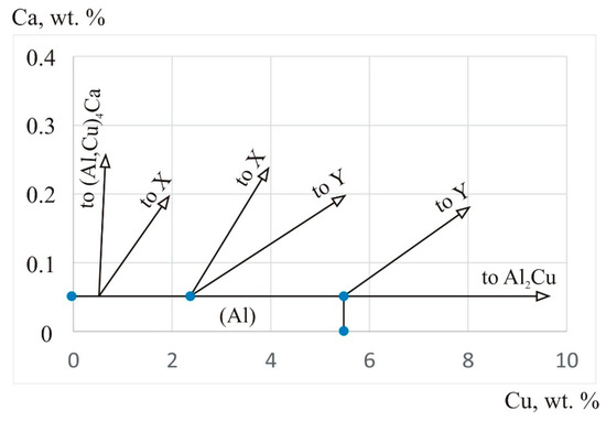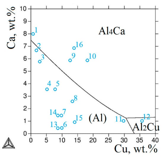 Several model alloys of the Al-Ca-Cu system (Table 1 and Figure 1) were chosen and prepared for studies. The alloys were prepared from 99.99% aluminum in a resistance furnace (GRAFICARBO) with a graphite crucible. Aluminum was placed in the crucible, and after its melting, copper in the form of pure metal (99.9 wt.% Cu) and calcium in the form of the binary Al-15%Ca master alloy were introduced into the melt. After the melting of the main components, the melt was held for 5–10 min to obtaining a homogeneous composition, and the metal was then cast into a 10 × 20 × 180 mm graphite mold. The cooling rate in the mold was about 10 K/s. For achieving a close-to-equilibrium state at least at the beginning of the solidification, some alloys were remelted and slowly solidified in the furnace chamber at a cooling rate of about 0.02 K/s.