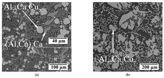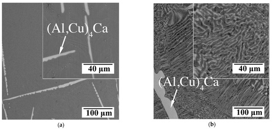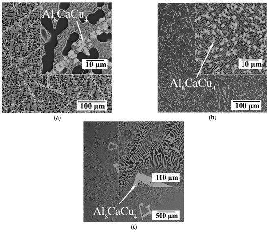 The Al30Cu1.0Ca and Al36Cu1.0Ca alloys were analyzed in order to clarify the primary crystallization area boundaries of another ternary Al8CaCu4 compound that is in equilibrium with the aluminum in this system. The microstructure of both alloys contains bright primary crystals (Figure 5a,b) which, according to the spectral analysis (Table 2), has an excess of copper as compared to the Ca-containing phases considered above. The chemical composition of these crystals obtained after slow solidification is somewhat different from that obtained after accelerated solidification. The latter fact can be coupled with the relatively fine structure of the crystals obtained after solidification, which prevents accurate measurements. Thus, according to the data for the slowly solidified alloy, the observed primary crystals correspond perfectly well to the Al8CaCu4 phase [25]. One can also note that the slow solidification of the Al36Cu1.0Ca alloy (Figure 5c) also revealed the presence of lone Al8CaCu4 phase primary crystals against the background of the eutectic. The latter fact confirms that the alloy is located near the eutectic point.