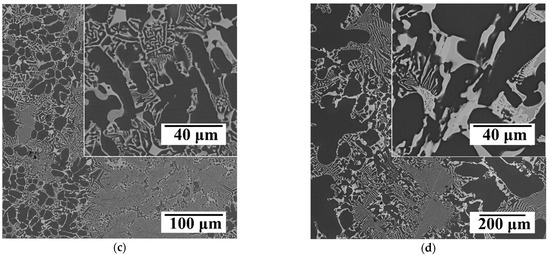 The Al14Cu2.5Ca and Al18Cu6.0Ca alloys were analyzed in order to clarify the boundaries of the primary crystallization area of the Al27Ca3Cu7 compound. For the Al18Cu6.0Ca alloy, two types of coarse primary crystals are also observed (Figure 3a). The bright faceted crystals in Figure 3a are identified as the Al27Ca3Cu7 phase, whose chemical composition perfectly matches that of the crystals in the Al14Cu6.0Ca alloy considered above. The second type of crystals, which are grey and elongated, are the (Al,Cu)4Ca phase. The XRD data for this alloy (Figure 4) confirmed its phase composition consisting of both of the extra phases. However, after slow solidification (Figure 3b), only Al27Ca3Cu7 phase primary crystals are observed. The latter fact confirms that the alloy pertains to the primary crystallization area of the Al27Ca3Cu7 phase, but is close to the (Al,Cu)4Ca/Al27Ca3Cu7 boundary. After accelerated cooling, the Al14Cu2.5Ca alloy has a near-eutectic structure (Figure 3c) with lone Al27Ca3Cu7 phase primary crystals. The presence of those crystals in the structure was also confirmed by XRD analysis (Figure 4). Along the Al27Ca3Cu7 phase crystals, the patterns typical of the Al8CaCu4 phase [25] were also observed. After slow solidification, the alloy has a hypoeutectic structure (Figure 3d) with a high eutectic fraction. These facts demonstrate that the alloy is located at the boundary between two (Al)/Al27Ca3Cu7 primary crystallization areas and concurrently near a ternary eutectic point.