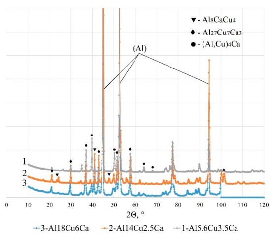 XRD data for (1) Al5.6Cu3.5Ca, (2) Al14Cu2.5Ca and (3) Al18Cu6Ca alloys. CoKα radiation.
