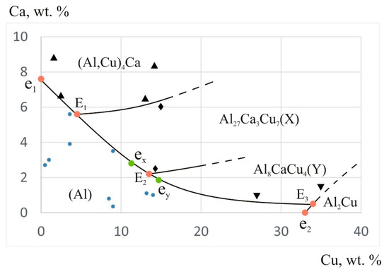 The aforementioned experimental data allow for hypothesizing regarding the boundaries of the primary crystallization areas of the phases considered. It is worthy of note that the analysis did not reveal any traces of peritectic transformations. The structure of the eutectic type diagram is therefore suggested to have two quasi-binary sections: (Al)-Al27Ca3Cu7 and (Al)-Al8CaCu4 (Figure 7). Indeed, the arrangement of the alloys on the diagram in accordance with the type of primary crystals observed in the structure suggests the existence of three invariant eutectic and two quasi-binary eutectic phase transformations (Table 3). In comparison with another eutectic Al-Ce-Cu system containing one quasi-binary section (Al)-Al8CeCu4 and two invariant eutectic transformations (at ~12% Cu, 7% Ce, E1; ~32% Cu, 0.5% Ce, E2) in the aluminum corner, the new Al-Ca-Cu system is preferable for the design of aluminum matrix composites with an excess of eutectic. Indeed, the E1 point in the new Al-Ca-Cu system is located at the copper content typical of industrial alloys, whereas a much higher copper concentration is needed for the Al-Ce-Cu system (~12% Cu for the E1 eutectic point). Moreover, taking into account the very similar content of the third component (7% Ce and 6% Ca) at the E1 point in the systems, the use of cheaper and lighter calcium instead of cerium is preferable. One should note that the estimated position of E3 in Al-Ca-Cu is very close to that of the respective E2 points in the Al-Ce-Cu system. It can therefore be concluded that the position of E3 is calculated with an acceptable accuracy. In comparison with another copper containing ternary system in which the third component has a very limited solubility in aluminum, i.e., Al-Cu-Fe [29], the position of this point is also quite close (~32.5% Cu, 0.3% Fe) to the respective point in the new system.