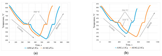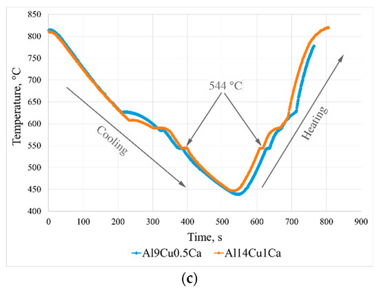 To assess the temperature of the invariant phase transformations, some alloys from the corresponding phase fields were subjected to thermal analysis in order to plot their cooling and heating curves (Figure 8). The temperature of invariant transformation is visualized as a platform at a constant temperature. The Al9Cu3.5Ca and Al14Cu7Ca alloys were chosen since they pertain to the (Al) + (Al,Cu)4Ca + Al27Ca3Cu7 ternary phase field, and their solidification must end at the temperature of the E1 eutectic transformation. Thermal analysis showed (Figure 8a) that the L→(Al) + (Al,Cu)4Ca + Al27Ca3Cu7 eutectic transformation temperature is about ~595 °C, which is ~22 °C lower than that of the L→(Al) + (Al,Cu)4Ca eutectic transformation in the binary system [16]. The next two Al9Cu1.5Ca and Al14Cu2.5Ca alloys pertain to the other ternary phase field, (Al) + Al27Ca3Cu7 + Al8CaCu4, and their solidification must end at the temperature of the E2 eutectic transformation. An analysis revealed that the latter temperature is also close to 594–595 °C. One should note that since the positions of the eutectic points eX and eY in the quasi-binary sections are quite close to the invariant eutectic point E2, the difference in the temperatures should also be negligible. Thus, the temperatures of the eX and eY transformations can be assumed to be a few degrees higher than that of E2. Additional precision studies are required for a more accurate determination of these temperatures. One should note that the thermal curves of the Al14Cu2.5Ca alloy contain one more very narrow platform at ~544 °C (marked by arrow in Figure 8b). This transformation is a prime consequence of the elevated solubility of copper in aluminum (to be discussed below) leading to the (L→(Al) + Al8CaCu4 + Al2Cu) ternary eutectic transformation, which is non-equilibrium for this phase field. On the contrary, equilibrium solidification of the last two Al9Cu0.5Ca and Al14Cu1Ca alloys must end via this ternary transformation, the temperature of which is about 544 °C (Figure 8c). This temperature is close to that of the L→(Al) + Al2Cu eutectic transformation in the binary system (548 °C) and the ternary eutectics at the respective points in the Al-Ce-Cu (545 °C) and Al-Ce-Fe (542 °C) systems.