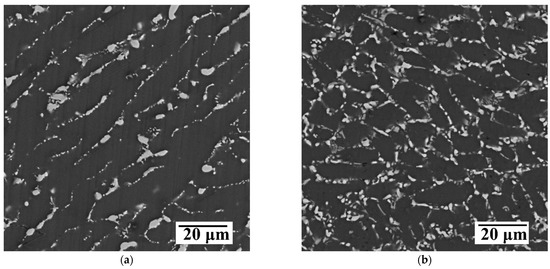 SEM microstructure of the alloys: (a) Al10Cu0.5Ca and (b) Al10Cu1.5Ca after homogenization annealing at 530 °C for 12 h.