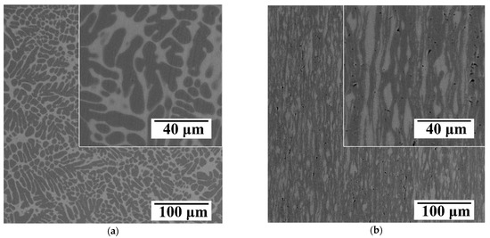 The prospects of this system for designing new eutectic type alloys with a natural composite structure are demonstrated for the example of the Al3Ca0.5Cu and Al3Ca1Cu alloys. Indeed, as one can see from Figure 11, both alloys are hypoeutectic (Figure 11a,c) and have an ultra-fine eutectic component. Both alloys are near the boundary between the (Al) + (Al,Cu)4Ca/(Al) + (Al,Cu)4Ca + Al27Ca3Cu7 phase fields with a predominant eutectic (Al,Cu)4Ca phase. The alloys without preliminary annealing were subjected to hot rolling at a moderate temperature of 300 °C to 2 mm sheets (a total deformation degree of 80%). A microscopic analysis (Figure 11b,d) did not reveal any significant refinement of the structure upon deformation processing. Indeed, the as-cast eutectic colonies are still well resolved, but they are elongated in the rolling direction. The slight differences from the as-cast structure are due to the relatively low degree of deformation.