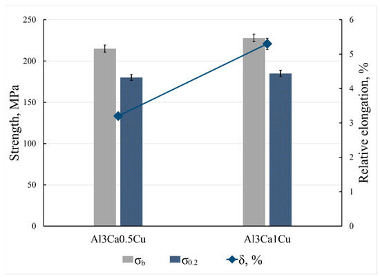 The hardness of both alloys after rolling is about the same, ~60 Hv. The obtained hot rolled sheets were also subjected to uniaxial tensile tests. The data on the mechanical properties are presented in Figure 12. The obtained level of mechanical properties is moderate yet acceptable for base model alloys. Indeed, in comparing these alloys with the closest counterparts containing a similar [30] or a higher [31] amount of calcium but more expensive rare earth metals (UTS 240–260 MPa, YS 85–205 MPa and δ 5.5–9.0%) [30,31] and nickel (UTS ~190–303 MPa, YS ~150–220 MPa and δ ~0.5–5%) [31] instead of copper, one can see similar mechanical properties, while the latter alloys contain additional hardening additives. One should also note that due to both the eutectic-type structure of the system and the presence of a high amount of numerous insoluble aluminides, the new system and the alloys may be promising for additive manufacturing techniques such as selective laser melting.