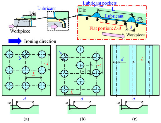 In this work, laser-textured dies with lubrication pockets have been utilized for the ironing of aluminum alloy sheets and stainless steel cups. Different array patterns of a micro-pocket-textured die surface were employed. The objectives of the present study are to examine the effect of array patterns of micro-pocket-textured dies on the improvement of seizure resistance, and to investigate the underlying physics of lubricant flow in the strip ironing process of aluminum alloy sheets with different array patterns of micro-pocket-textured die surfaces using three-dimensional computational fluid dynamics simulations. The tribological characteristics of the grid and crossing array patterns of a micro-pocket-textured die surface were compared. In addition, the optimum lubricant pocket was further applied to the ironing of cylindrical stainless steel cups.