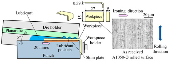 Strip ironing was conducted to evaluate the performance of the geometrical parameters of the micro-pockets on seizure resistance. Figure 3 shows a schematic of the strip ironing. Planar dies with different array patterns of lubricant pockets were used to iron flat A1050-O aluminum strips. The ironing was performed along the transverse rolling direction of the sheet, although the rolled surface of the aluminum sheets has a manufacturing texture oriented along the rolling direction. The effect of sheet surface texture orientation on seizure resistance was not considered because the sheet textures did not function when the surface was completely flattened by a large deformation [6]. The lubricant, paraffinic mineral oil without an extreme pressure additive (ISO VG500) with a kinematic viscosity of 433 mm2/s at 40 °C was applied to the die-workpiece interface. The ironing speed was set at 20 mm/s. A load cell (UBFH-2kN, Unipulse Corp., Tokyo, Japan) was installed between the punch and rod of a press to capture an ironing load signal. The signal was amplified using a strain amplifier (GL7-DCB, Graphtec Corp., Yokohama, Japan) and recorded using a data logger (GL7000, Graphtec Corp., Yokohama, Japan) at a sampling rate of 1 kHz. The ironing ratio r is determined by the difference between the initial and ironed sheet thickness divided by the initial sheet thickness as expressed by Equation (1). The ironing ratio was changed to accelerate the occurrence of seizure. To change the ironing ratio, the clearance between the die and punch was altered by changing the thickness of the shim plate located between the punch and workpiece. Each ironing condition was repeated three times. After ironing, the adhesion of work material on the die and the seizure on the workpiece surface occurring at certain ironing ratios were observed by an optical microscope. Seizure resistance, also known as the ironing limit, is defined at a maximum ironing ratio that has no occurrence of seizure.