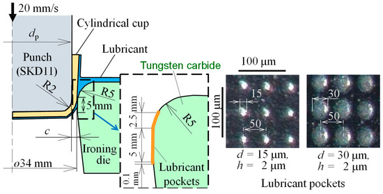 - Abe, Y.; Mori, K.; Hatashita, F.; Shiba, T.; Daodon, W.; Osakada, K. Improvement of seizure resistance in ironing of stainless steel cup with cermet die having fine lubricant pockets. J. Mater. Process. Technol. 2016, 234, 195–207. [Google Scholar] [CrossRef]