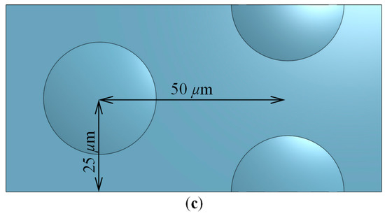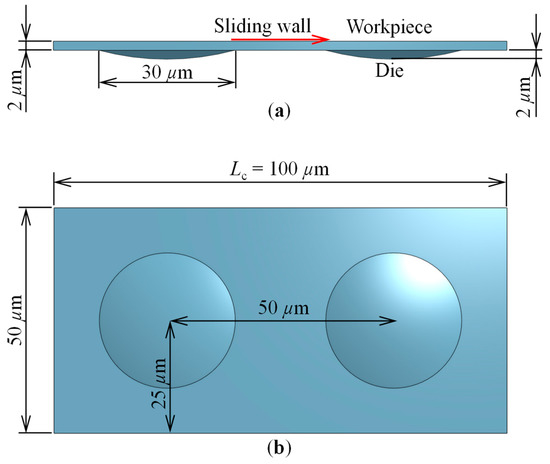 The computational fluid dynamics (CFD) analysis was performed by using ANSYS Fluent 19.2 software. The underlying physics of the lubricant’s flow behavior in circular pockets with optimal geometrical parameters arranged in grid and crossing array patterns as discovered by strip ironing findings was analyzed. The tribological components can be roughly simplified as a two parallel contacting couple between the die and the workpiece with thin-film lubrication. The geometrical model of the simplified contacting couple and the computational fluid domain with micro-lubricant pockets are presented in Figure 5. The width and the length of the domain are 50 µm and 100 µm, respectively. The gap between the die and the workpiece is 2 µm. The depth and the diameter of a micro-pocket unit are 2 µm and 30 µm, respectively. The distance between pockets is 50 µm. For the grid array pattern, there are two micro-pocket units along the centerline of the plate (Figure 5b). For the crossing array pattern, there is one micro-pocket unit along the centerline of the die plate, and two halves of a micro-pocket unit are located at the side edges of the die plate (Figure 5c).