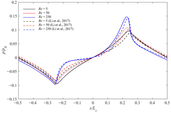 It is crucial to ensure that the CFD simulations provide reliable results. Thus, lubricant flow between a two parallel contacting couple is modelled using only a single micro-pocket unit. Parameters, geometries, and boundary conditions are adopted from Li et al. [38]. The pressure distribution on the middle plane of the micro-pocket unit is investigated at Reynolds numbers equal to 5, 50, and 250, respectively. Figure 6 shows that the results agree well with those of Li et al. [38]. The pressure decreases upstream, rises significantly over the front part of the micro-pocket unit, reaches the maximum value at the rear part, and then decreases to zero downstream. It is obvious that as the Reynolds number increases, the pressure distribution becomes closer to those of Li et al. [38].