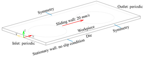 The boundary conditions and parameters are defined as shown in Figure 7. A periodic boundary condition is applied at the inlet and the outlet. A symmetrical boundary condition is imposed at side edges. A no-slip boundary condition is assigned on the die and the workpiece. The speed of the workpiece is set at 20 mm/s, while the die plate is stationary. The x, y, z define the streamwise, spanwise, and wall-normal directions, respectively.