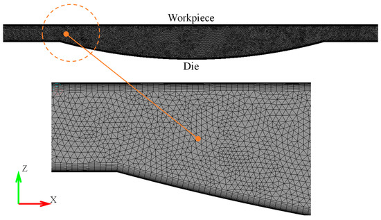 Meshes are generated based on the three-dimensional model of a two parallel contacting couple between the die and the workpiece with thin-film lubrication, as shown in Figure 8. A mesh type tetrahedral is employed in the region far away from the die and workpiece surfaces, while the triangular prism mesh type is utilized in the inflation layers. Both mesh types, based on triangular surfaces, are appropriate for the domain containing curved surfaces. The average skewness and orthogonal quality are 0.176 and 0.823, respectively. Fifteen inflation layers are used near surfaces to capture the flow behavior in the boundary layer.