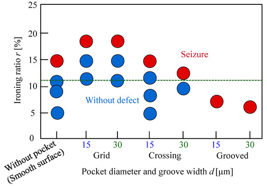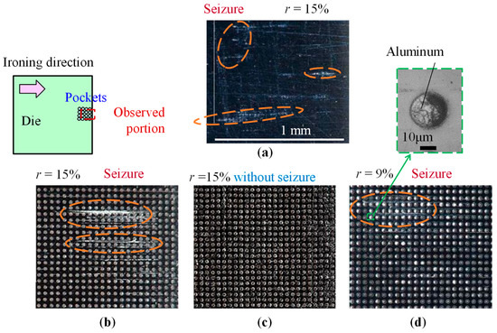 The grid-array patterned circular pockets were used to investigate the effect of pocket depth on the occurrence of seizure. Both the pocket diameter and the distance between pockets were maintained at d = 30 µm and L = 50 µm, respectively, as shown in Figure 10. In comparison with the smooth surface die at the same ironing ratio of 15%, only the pocket depth of 2 µm prevented seizure, but the workpiece material adhered and seized for the shallow pocket depth of 1 µm, and the deeper pocket depth resulted in early seizure at the low ironing ratio.