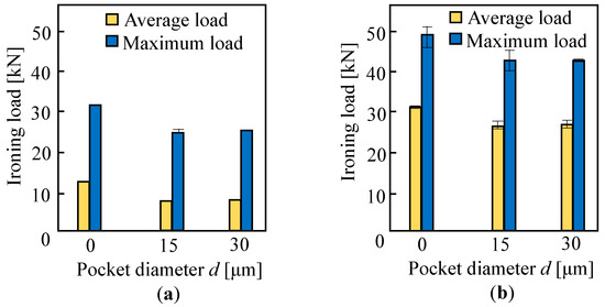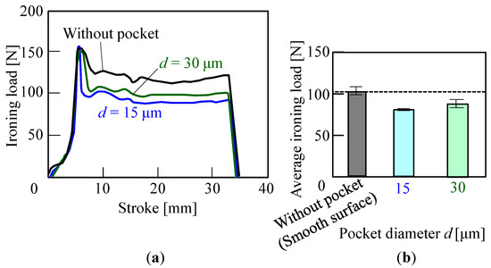 Ironing load-stroke curves and an average ironing load with an ironing ratio of 10% is shown in Figure 12. Although the maximum ironing loads with and without the lubricant pockets are similar at a stroke of about 5 mm, the ironing loads with the lubricant pockets are smaller than that of the ironing load without the lubricant pockets. The average ironing load shows the maximum decreasing by 20% with the pocket diameter of d = 15 µm.