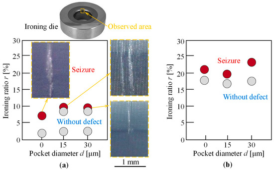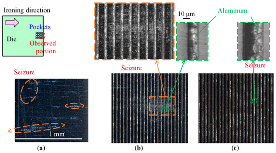 The occurrence of the seizure on the die crossing array pattern, pocket diameter d of 15 µm at r = 15%, and d of 30 µm at r = 12% is shown in Figure 13. In d = 15 µm of the array pattern, the seizure continuously appears in the ironing direction on the flat portion between pockets in the die surface. Although the seizure area is lager in d = 30 µm of the array pattern with the smaller ironing ratio, the seizure does not appear on the flat surface of the pocket outlet side. Both ironing limits for the die crossing array pattern are the same or less than the limit for the smooth surface die.