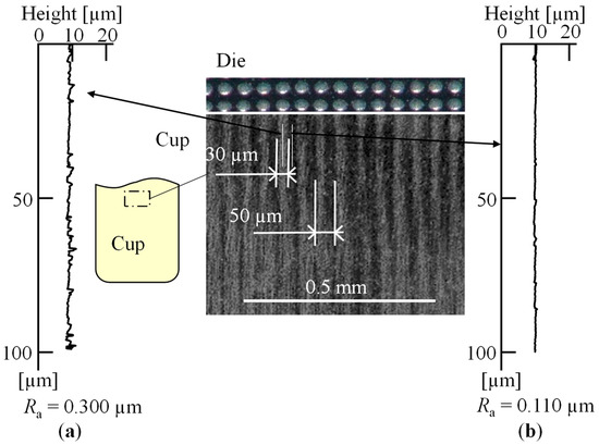 The strip ironing dies were JIS SKD11 cold work tool steel hardened to a hardness of 791 HV and finished by grinding, followed by polishing to a smooth surface prior to the laser texturing process. The surface roughness was measured using a surface roughness measuring instrument (SJ-210 series, Mitutoyo Corp., Kanagawa, Japan) with a 2D stylus method using an 8 mm measured length with a 0.8 mm cut-off and a magnification of 10,000. The hardness of the strip and cup materials was measured using a microhardness tester (HMV, SHIMADZU Corp., Kyoto, Japan). The arithmetic average roughness Ra of the strip ironing dies was 0.01 µm. The strip material was an A1050-O aluminum alloy with a thickness of 0.59 mm and width of 15 mm. The arithmetic average roughness in the ironing direction, Ra, and hardness of the sheets were 0.12 µm and 23 HV, respectively. For cylindrical cup ironing, the die was made of tungsten carbide-cobalt (WC-Co), with a hardness of 1600 HV and an arithmetic average roughness in the ironing direction, Ra = 0.004 µm. The cylindrical cups were made of ferritic stainless steel SUS430 with an average sidewall thickness of 0.59 mm. The arithmetic average roughness in the ironing direction, Ra, and the hardness of the cup were 0.42 µm and 167 HV, respectively. The reported surface roughness and hardness values were the averages of at least three measurements.
