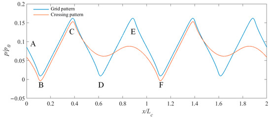 Investigations were made into the underlying physics of the lubricant’s flow behavior in an optimum array pattern. As demonstrated by the strip ironing results, the grid array pattern exhibits greater seizure resistance improvement than the crossing one, and the pocket diameter of 30 μm produces a substantially different ironing limit between the two circular array patterns; therefore, these two array patterns were compared. The pressure distribution along the middle plane of the workpiece with grid and crossing array patterns is shown in Figure 20. It is noted that A to F represent locations along the middle plane of the die with the grid array pattern: the leading edge (A), entrance of the first micro-pocket unit (B), exit of the first micro-pocket unit (C), entrance of the second mircro-pocket unit (D), the exit of the second micro-pocket unit (E), and the entrance of the third micro-pocket unit (F), respectively. From point A to point B, the flow is from the leading edge of the die towards the entrance of a micro-pocket unit. It shows that the pressure gradually decreases and reaches its minimum value at the entrance of the micro-pocket unit at point B. The pressure then continuously increases across the micro-pocket unit and reaches its maximum value at the exit of the micro-pocket unit, at point C. For the grid array pattern, the flow is from the exit of the micro-pocket towards the entrance of the next micro-pocket unit, point C to point D. Thus, the pressure gradually decreases similarly to that which happens from A to B. It happens repeatedly as a cycle along the middle plane of the workpiece.