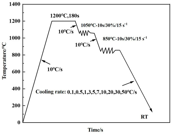 The effect of different cooling rates on the continuous cooling transformation of the undercooled austenite of the test steel can be obtained using a dynamic CCT test. The following thermal simulation test parameters were selected through a combination of extensive prior experimental exploration and the determination of the phase transformation point of the test steel using the thermal expansion test (AC1 736 °C and AC3 906 °C). In the Gleeble 3500 (Dynamic Systems Inc., El Segundo, CA, USA) thermal simulation tester, the program was set to heat up to 1200 °C at a rate of 10 °C/s, hold for 180 s to completely austenite the specimen, fully re-dissolution the microalloy elements, then cool down to 1050 °C at a rate of 10 °C/s, hold for 10 s to eliminate the temperature gradient in the specimen, then apply 30% deformation to the specimen at a deformation rate of 15 s−1, then cool down to 850 °C at 10 °C/s, hold for 10 s and then apply 30% deformation to the specimen at a deformation rate of 15 s−1. Then, it is cooled to room temperature at a cooling rate of 0.1, 0.5, 1, 3, 5, 7, 10, 20, 30 and 50 °C/s; the test measurement curve is shown in Figure 1. The sizes of thermal simulation test samples were Φ6 mm × 15 mm and Φ4 mm × 10 mm, respectively, the former being used for cooling rate experiments below 30 °C/s, and the latter being used for cooling rate experiments from 40 to 60 °C/s.