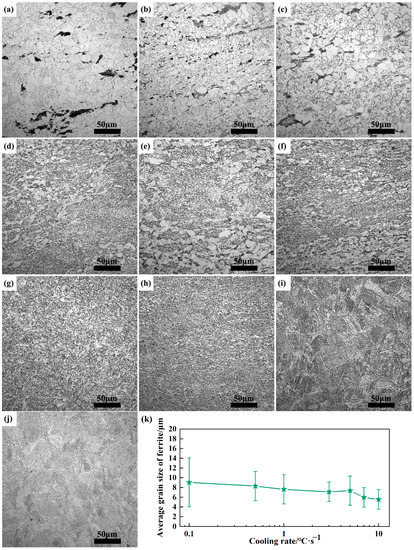 Microstructure of test steel at different cooling rates: (a) 0.1 °C/s; (b) 0.5 °C/s; (c) 1 °C/s; (d) 3 °C/s; (e) 5 °C/s; (f) 7 °C/s; (g) 10 °C/s; (h) 20 °C/s; (i) 30 °C/s; (j) 50 °C/s; (k) average grain size of ferrite at different cooling rates.