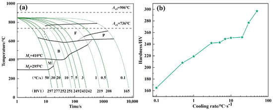(a) Dynamic CCT curve of test steel; (b) hardness of different cooling rates of test steel.
