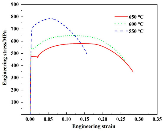 Table 2 and Figure 4 show the mechanical properties and engineering stress–strain curves of the test steels at different coiling temperatures. At a coiling temperature of 650 °C, the yield strength of the test steel reached 464 MPa, the tensile strength reached 581 MPa, the yield ratio was 0.80, the elongation after fracture was 29.5% and the elongation at yield point was 1.81%. When the coiling temperature was lowered to 600 °C, the yield strength and tensile strength of the test steel increased to 538 MPa and 645 MPa, respectively, and the yield ratio increased to 0.83, whereas the elongation after fracture decreased to 26.1% and the yield point elongation decreased by a larger extent to 0.59%. In general, the steel used in building structures needs to have a lower yield ratio and a longer yield platform while having a higher strength, so that it can absorb more energy under the repeated action of seismic loads to meet the requirements of the seismic performance of high-performance building steel [14,15]. When the coiling temperature was further reduced to 550 °C, the strength of the test steel was substantially improved, the yield ratio increased to 0.89, the elongation after fracture decreased to 15.6%, the yield platform disappeared and the engineering stress–strain curve exhibited continuous yielding, as shown in Figure 4.