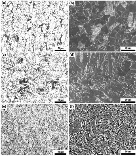 Microstructure of test steel at different coiling temperatures: (a,b) 650 °C; (c,d) 600 °C; (e,f) 550 °C.