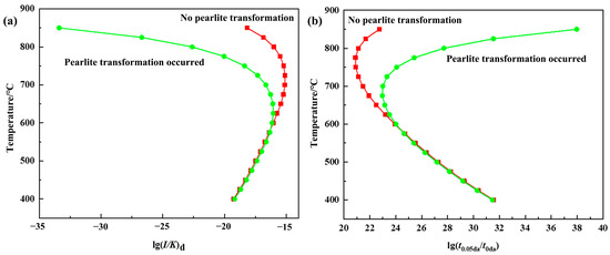 During the rolling process of Ti microalloyed steel, partial carbon and nitrogen titanium precipitation occurs. In order to be consistent with the actual production conditions, it is assumed that 50% of the strain-induced precipitation of carbon and nitrogen titanium in the experimental steel occurs between the starting rolling temperature and the final rolling temperature of 850 °C. Based on the equilibrium solid solubility at 850 °C, the relevant element concentrations in the experimental steel after finish rolling and before laminar cooling were [Ti] = 0.0397, [C] = 0.06255 and [N] = 2.25 × 10−7. Since the nitrogen content at this point was close to zero, the effect of nitrogen was not considered and the second phase precipitated in the ferrite was mainly TiC. The chemical free energy of TiC precipitation in the ferrite at different precipitation temperatures can be theoretically calculated using the solubility product formula. This can be divided into two parts: TiC precipitation before the pearlite transformation and TiC precipitation in the ferrite after the pearlite transformation, where the matrix carbon content decreases to 0.0218%. Figure 6 shows the NrT and PTT curves of TiC precipitation in the ferrite, where the NrT curve exhibits the characteristic of a reverse C curve and the PTT curve exhibits a C curve. The occurrence of the pearlite transformation reduces the carbon element supersaturation in the steel, especially reducing the value of the chemical free energy of the TiC precipitation, resulting in a slightly larger critical nucleus size, a moderate increase in critical nucleation work, a moderate decrease in nucleation rate and a significant delay in the start time of the precipitation transformation. At the time of the nucleation on a dislocation, the maximum nucleation rate temperature and the fastest precipitation temperature of TiC in the matrix without the pearlite transformation were 725 °C and 775 °C, respectively. However, when the matrix underwent pearlite transformation before TiC precipitation, the maximum nucleation rate temperature and the fastest precipitation temperature of TiC were 625 °C and 675 °C, respectively, which means that the occurrence of the pearlite transformation reduced these two temperatures by 100 °C each. This temperature reduction can lead to a lower actual precipitation transformation temperature and allow finer precipitation particles to be obtained.