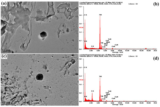 Large size precipitates of test steel at different coiling temperatures: (a) 650 °C; (c) 600 °C; (b,d) energy spectrum corresponding to precipitates.
