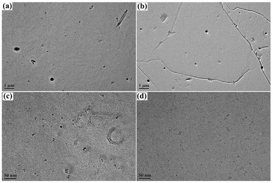 TEM observations were performed on the test steels at coiling temperatures of 650 °C and 600 °C for replica and thinning, respectively. Figure 7 and Figure 8 show the TEM observations of the precipitation phases for the replica specimens. During the cooling of the casting blank, Ti was easily combined with impurity elements such as C, N, S and O in steel to form large-sized precipitation phases, owing to its extremely strong chemical properties [19]. As shown in Figure 7a,c, the composite precipitation phase containing Ti with a diameter of approximately 200 nm can be determined from its energy spectrum as Ti4C2S4, which plays a role in controlling the growth of austenite grains during homogeneous heating [20]. Figure 8a,b shows the strain-induced precipitation of the second phase during the hot rolling process, and its size is generally above several tens of nanometers, which can inhibit high-temperature austenite recrystallization and prevent grain growth, playing a certain role in grain refinement; however, the precipitation strengthening effect is not significant [21].