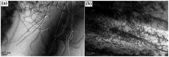 Dislocation configuration of test steel at different coiling temperatures: (a) 650 °C; (b) 600 °C.