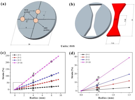 (a) Schematic diagram of measurement positions in the HPT disk specimen for Vickers microhardness measurement and microstructural analysis; (b) position extracted for tensile specimen with dimensions; (c) curves of strain-respectful position for TEM observation; (d) magnified strain–position pattern for the region marked by a black box in Figure 1c.