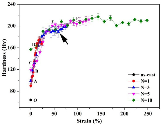 Figure 2 displays the hardness evolution as a function of the von Mises equivalent strain for the as-cast and the disk samples processed by HPT for 1, 3, 5, and 10 revolutions. The von Mises equivalent strain for as-HPT processed samples can be calculated based on the formula (N is the number of turns, r is the radius of the disk, and h is the disk thickness) [28], so the strain from the central region of disk samples is 0. In fact, the hardness values from the central region of the disks gradually increases with increasing torsion turns. The phenomenon has been explained based on the strain gradient plasticity theory [29]. It can be seen from Figure 2 that when the equivalent strain is below 80, the hardness value increases with the increasing strain. Additionally, the hardness value for the equivalent strain beyond 80 has reached a stable state with 20 Hv minor fluctuations. Moreover, under the same strain with different twisting turns, the corresponding hardness values from samples are slightly different as marked by a black arrow in Figure 2.