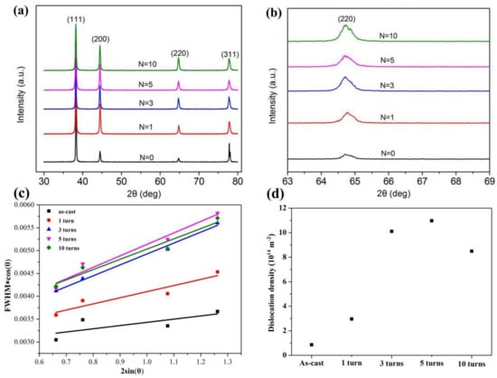 XRD patterns from the as-cast sample and the central region of as-HPT processed disk specimens with 1, 3, 5, and 10 revolutions are presented in Figure 3a. For all the sample conditions, no additional diffraction peaks are detected other than those representing the Al matrix. In addition, each diffraction peak is significantly broadened due to grain size refinement and dislocation density evolution subjected to different torsion turns. Figure 3b displays that the (220) diffraction peak of the as-cast and HPT samples for 1, 3, 5, and 10 turns gradually broadened with increasing HPT turns. The broadening of the XRD profile of HPT-processed samples is aroused by lattice defects, which are predominantly dislocations and additional grain boundaries. Figure 3c demonstrates a plot of FWHM × cos(θ) against 2sin(θ) for the (111), (200), (220), and (311) diffraction pattern, where the slope corresponds to the effective strain. Based on the liner fitting, it can be concluded that the effective strain of the central region from high-pressure torsional Al-4Mg-0.3Cu samples for 0, 1, 3, 5, and 10 revolutions are 0.0007, 0.0013, 0.0024, 0.0025, and 0.0022. According to the relationship between the effective strain and dislocation density (ρ) using the Williamson–Hall method [30], it can be concluded that the dislocation density is 0.86 × 1014 m−2, 2.96 × 1014 m−2, 10.11 × 1014 m−2, 10.97 × 1014 m−2, and 8.49 × 1014 m−2 for as-cast and as-HPT processed samples with 1, 3, 5, and 10 turns, as plotted in Figure 3d. The values of dislocation density in this experiment were in good agreement with a recent report for an Al-Cu-Mg alloy processed by HPT through 5 turns measured using X-ray diffraction line broadening [31].