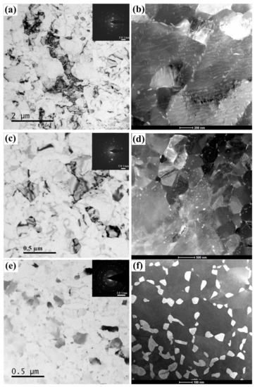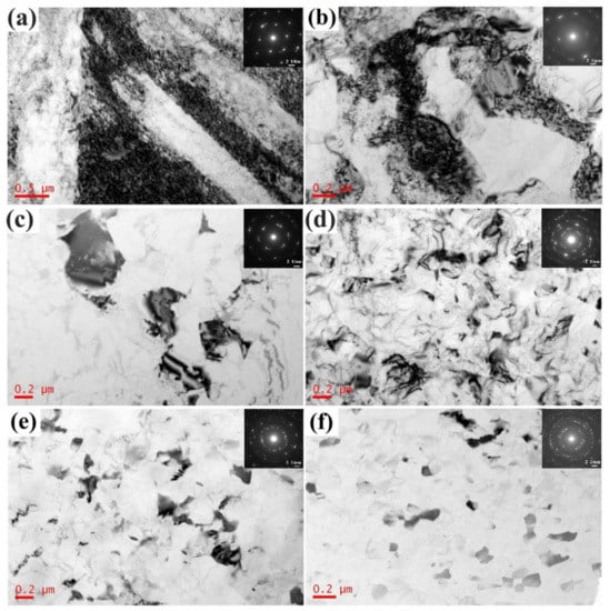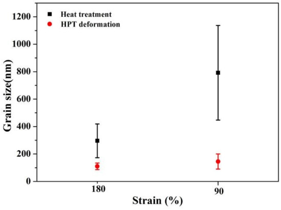 The thermal stability of the ultrafine grain Al-4Mg-0.3Cu alloy with a different grain structure was studied through heat treatment at 200 °C for 1 h. The evolution of the average grain size of the samples from locations E and F with strain ~50 and 100 and postannealing is plotted in Figure 11. As illustrated in Figure 11, the average grain size decreases from 140 to 100 nm with a strain increase from 50 to 100. After annealing treatment, the average grain size increases to 800 and 300 nm with strains of 50 and 100.