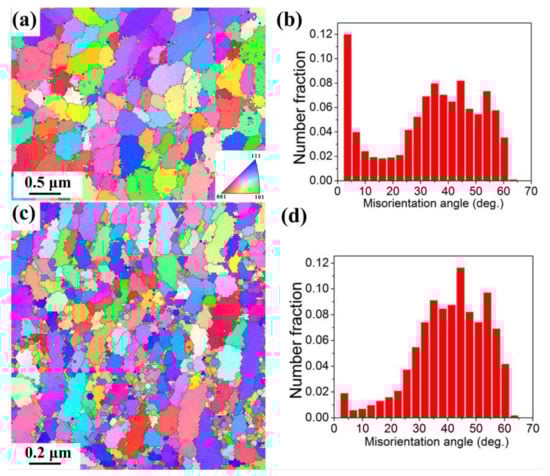 Due to a high dislocation density at GBs in the severely deformed samples, results were in blurred or nonexistent diffraction patterns and very low indexing rates. Therefore, the samples from locations E and F corresponding to equivalent strains 50 and 100 for EBSD pattern collection were heated to 200 °C for 10 min. Figure 5a,c demonstrate the EBSD inverse pole figure (IPF) maps of HPT-processed Al-4Mg-0.3Cu samples for locations E and F equivalent strains 50 and 100, where grain colors represent the various orientations of the grains, as denoted by the unit triangle in Figure 5a. Figure 5b,d show the evolution statistics histogram of the grain boundary misorientation of HPT-processed Al-4Mg-0.3Cu alloy for different strains. Comparing Figure 5b,d, it can be seen that the high-angle grain boundary fractions increase from 80% to 95% with increasing strain.