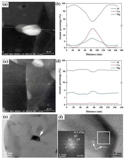 Magnified HADDF-STEM images of (a) precipitated phase located at GB and (c) GB near the GB precipitates; (b,d) corresponding to EDS line scanning profiles of the Al, Cu, and Mg elements along the yellow arrow in (a,c), respectively; (e) TEM micrographs of Al-4Mg-0.3Cu alloy with stain 100 after heat treatment; (f) HRTEM image of the precipitate in Figure 8e and FFT image suggest that the precipitate is Al2CuMg phase.