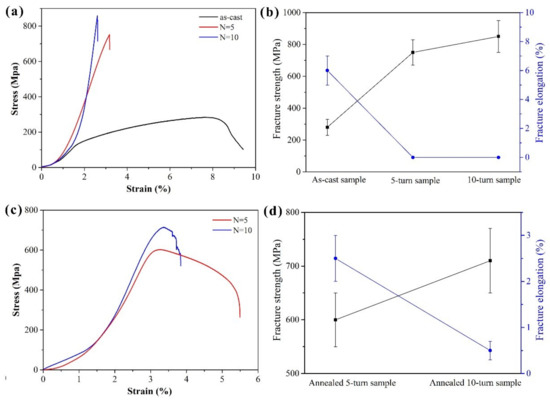 Stress-strain curves of (a) as-cast, 5-turn, and 10-turn HPT samples; (b) statistical summary of fracture strength and fracture elongation for as-cast, 5-turn, and 10-turn HPT samples; (c) stress–strain curves of post-HPT 5-turn and 10-turn samples; (d) statistical summary of fracture strength and fracture elongation for post-HPT 5-turn and 10-turn samples.