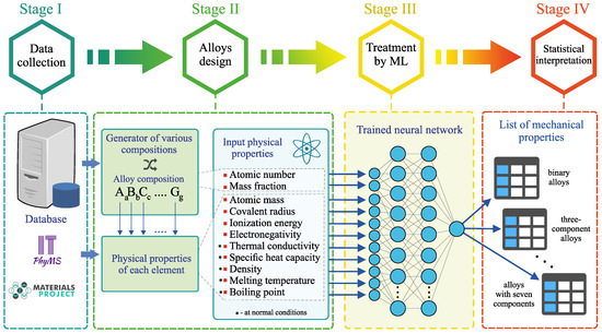 - Stage III. Information about the alloy composition and the physical properties of all the chemical elements is processed by the pre-trained neural network. This neural network evaluates the Young’s modulus E and the yield strength for all generated alloys. The training procedure of the neural network is discussed in more details in the subsection “Machine learning model: structure and training”.