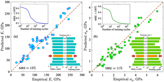 (a) Plot of the predicted Young’s modulus E versus the empirical E. (b) Plot of the predicted yield strength versus the empirical . Top insets: mean relative error as function of the number of training cycles for E and . Bottom insets: dependence of the mean relative error and the training cycles on the training rate , from which the optimal value of (indicated by the red arrows) was determined.