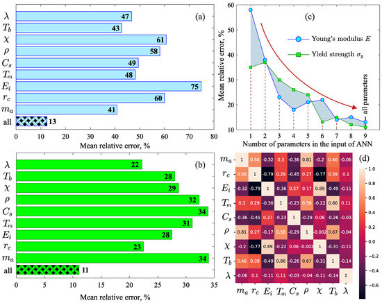 Importance scores for each physical property: (a) in the case of the Young’s modulus and (b) in the case of the yield strength. (c) Mean relative error as a function of the number of parameters in the artificial neural network input. (d) Pearson correlation heat map for the considered physical properties.