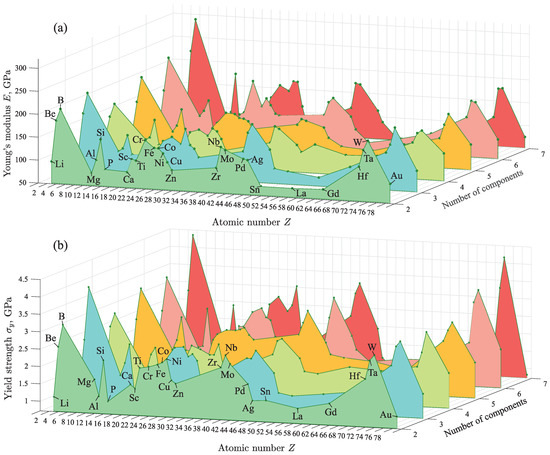 3D plot of the dependence of the mechanical properties on the atomic number Z of the basic chemical element in the alloy and on its number of components: (a) for the Young’s modulus E and (b) for the yield strength .