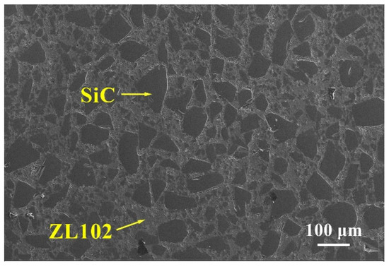 The 65 vol.% SiCp/ZL102 composites were provided by Hunan Haoweite Technology Development Co., Ltd. (Changsha, China), with the size of 20 × 10 × 2 mm. The scanning electron microscope image of the composite is shown in Figure 1. The DM305 electronic glass was provided by Jiangsu Yafei Special Glass Co., Ltd. (Lianyungang, China) of a size of 20 × 10 × 2 mm. In addition, the ZL102 is an aluminum–silicon alloy, and the DM305 is a borosilicate glass. The chemical composition of the ZL102 alloy and DM305 glass are shown in Table 1 and Table 2. In this research, a paste glass filler (2:1 borosilicate glass powder and terpineol mix) was used as the filler. The chemical composition of borosilicate glass was SiO2-B2O3-ZnO-NaO2. The coefficients of thermal expansion (CTE) of the 65 vol.% SiCp/ZL102 DM305 electronic glass and glass filler used in this work at 0~300 °C are shown in Table 3.